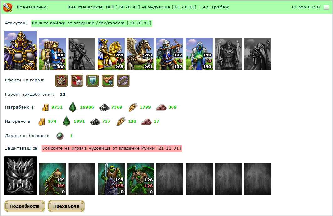 Забравих че си рицар и носачите ти носят 2 пъти повече от другите раси...мда - така и не разбирам за какво ги пращаш тия коне на 2ка - дай ми логично обяснение, че нещо не схващам...Null написа:Няма да изпадам в излишна полемика. С такава армия бия поредни руини. Армия не съм губил от много време. С 400 носачи изнасям целия ресурс в руината: