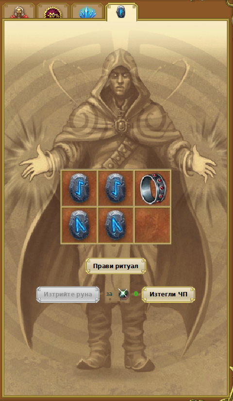 Magical rituals with Antique Runes can be performed in Treasury’s Runemaster tab (and in the Hero window).