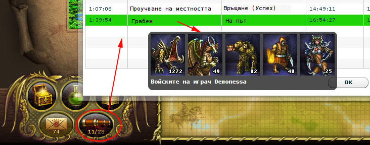 След изпращането на мисията нейното предвижване може да се види от бутона на Мисията. За да видите състава на армията, посочете с мишката типа мисия (например, думата «Грабеж»)
