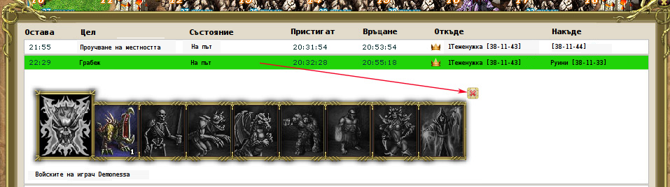 За да ги отзовете, отворете реда на мисията, като кликнете върху него. И в отворилия се прозорец кликнете върху кръстчето вдясно от войските.