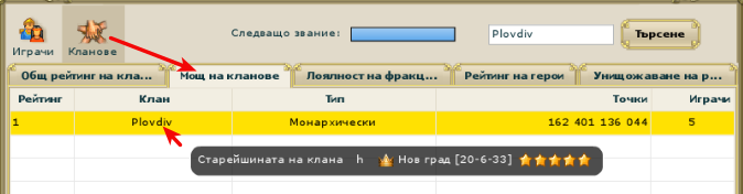 Когато търсенето даде резултат, посочете с мишката името на клана и в отворилото се прозорче ще видите името на Старейшината и координатите на неговата Столица.