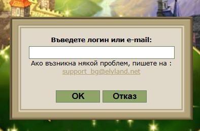 2. В изскачащия прозорец въведете своя ник или имейл адрес, към който е свързан Вашият акаунт в играта.