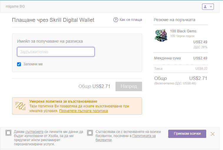 1. Изберете начин на плащане "Skrill (moneybookers)".