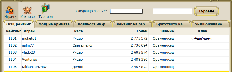 ВНИМАНИЕ! За мините и рудниците правилото за званията не важи. Играч с всякакво звание може да атакува Мини и Рудници от всякакво ниво.